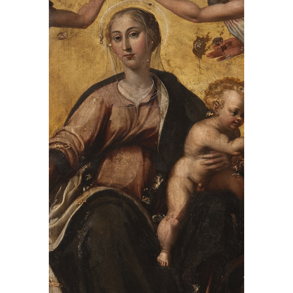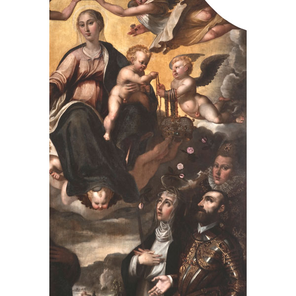 La grande tavola della Madonna del Rosario venne realizzata alla fine del XVI sec. per essere collocata nel Santuario di Madonna dell'Arco sito a poca distanza della chiesa madre di Sant'Anastasia (NA). La nobile famiglia dei Capecelatro, committenti del dipinto e raffigurati a sinistra della Vergine in basso, fecero trasferire l'opera nella nuova cappella che avevano eretto in Santa Maria La Nova nei primi decenni del seicento. Probabilmente nel XVIII sec. si operano delle modifiche. Le dimensioni della tavola vennero ridotte e scomparvero i misteri del rosario che la contornavano. A causa di una pulitura molto aggressiva eseguita nel XIX secolo la superficie presentava molteplici abrasioni e assottigliamenti della pellicola pittorica. Il Professor Pierluigi Leone de Castris ha attribuito il dipinto al pittore fiammingo Aert Mytens. |